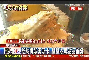 扬名国际的小吃又多了一项,答案就是绵绵冰,纽约一名华裔男生在湾吃到绵绵冰后惊为天人,决定引进到纽约大力推广,而他开发的绿茶绵绵冰,也在上个月参加有纽约摊贩界奥斯卡之称的摊贩大赛,在激烈的甜品竞赛中脱颖而出,夺得甜品类首奖。